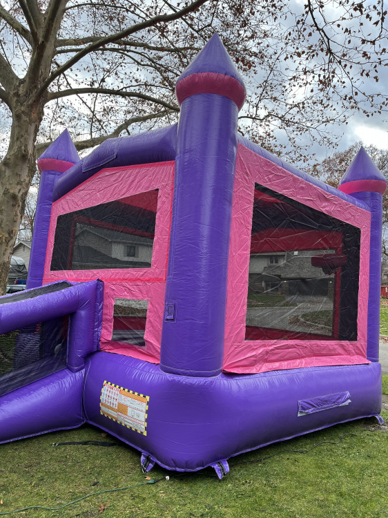 Make your party more elegant by adding a pretty Pink & Purple castle bounce house! This bounce house has room to jump plus two pop ups and a basketball hoop. No more than 6 riders at a time.