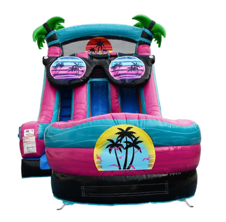 If Miami Vice had a waterslide - this would be it! Standing 18 ft tall and showing off a cool pair of shades, it's sure to be the coolest thing at the party. As you and a friend slide down the two lanes, you'll feel like your riding a giant wave or a waterslide on the beach!